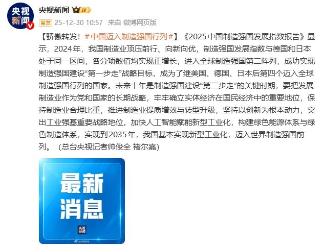 据@央视新闻消息,《2025中国制造强国发展指数报告》显示,2024年,我国制造业顶压前行、向新向优,制造强国发展指数与德国和日本处于同一区间,各分项数值均实现正增长,进入全球制造强国第二阵列,成功实现制造强国建设“第一步走”战略目标,成为了继美国、德国、日本后第四个迈入全球制造强国行列的国家。未来十年是制造强国建设“第二步走”的关键时期,要把发展制造业作为党和国家的长期战略,牢牢确立实体经济在国民经济中的重要地位,保持制造业合理比重,推进制造业提质增效与转型升级,坚持以创新为根本动力,突出工业强基重要战略地位,加快人工智能赋能新型工业化,构建绿色能源体系与绿色制造体系,实现到2035年配资股票一览表最新公告,我国基本实现新型工业化,迈入世界制造强国前列。(总台央视记者帅俊全 褚尔嘉)